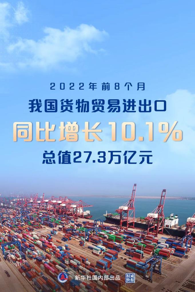 新华社北京9月7日电(记者邹多为)海关总署7日发布数据,今年前8个月,我国货物贸易进出口总值27.3万亿元,同比增长10.1%。