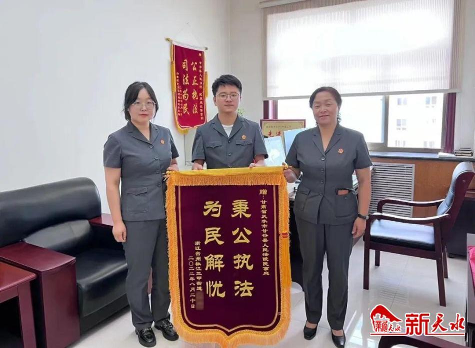 新天水讯【记者蔚军平】近日,一个从浙江寄来的邮件送到了甘谷县人民法院法官董雪莉手中,当她打开一看,原来是一面赠送给她的写有“秉公执法、为民解忧”的锦旗,看着落款处的名字,董雪莉立即明白了这是一起案件的当事人金某寄来的。