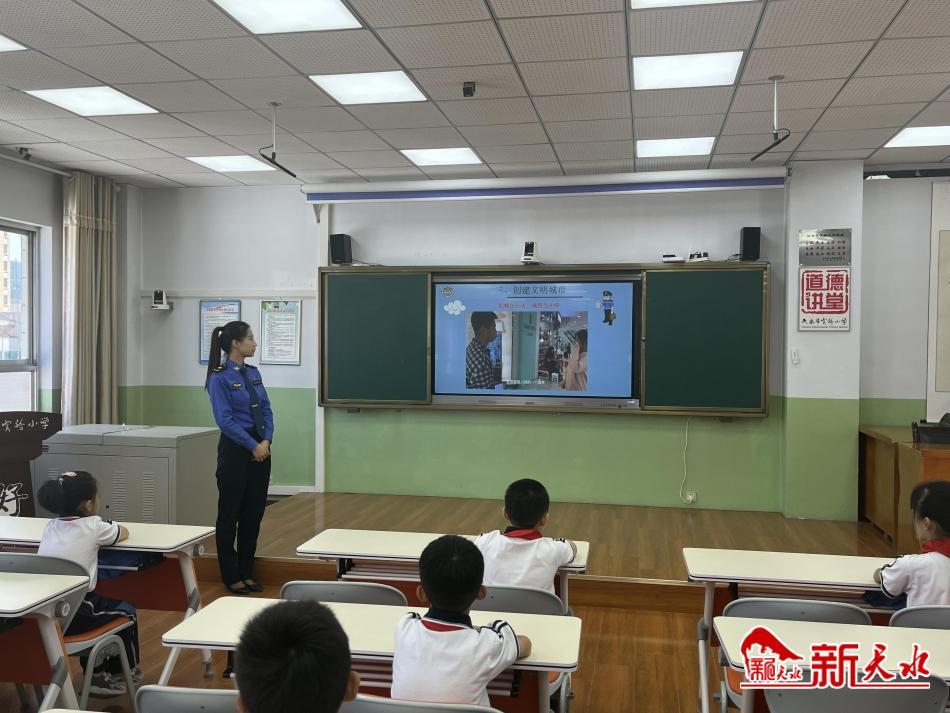 9月7日,在开学的第一天,秦州区城市管理综合执法局东关中队执法人员来到天水市实验小学、建设路第二小学开展了“大手拉小手、创城一起来”走进校园宣讲活动。