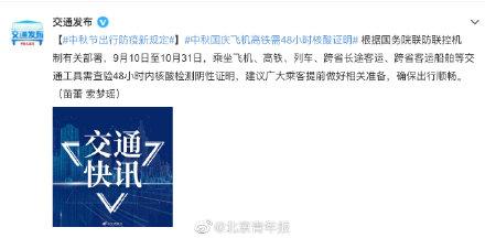 根据国务院联防联控机制有关部署,9月10日至10月31日,乘坐飞机、高铁、列车、跨省长途客运、跨省客运船舶等交通工具需查验48小时内核酸检测阴性证明,建议广大乘客提前做好相关准备,确保出行顺畅。(交通发布)