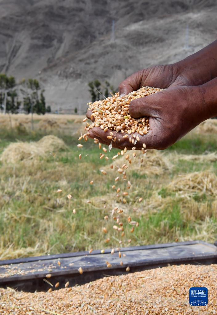 林周县边林乡当杰村玉冲组的村民在检查收获的小麦(9月6日摄)