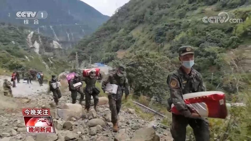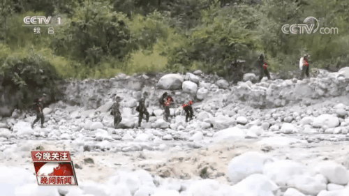 刚刚分发完物资,官兵们又返回山下,继续救援。返程途中,官兵们还帮助村里有需要的群众,进行转移。
