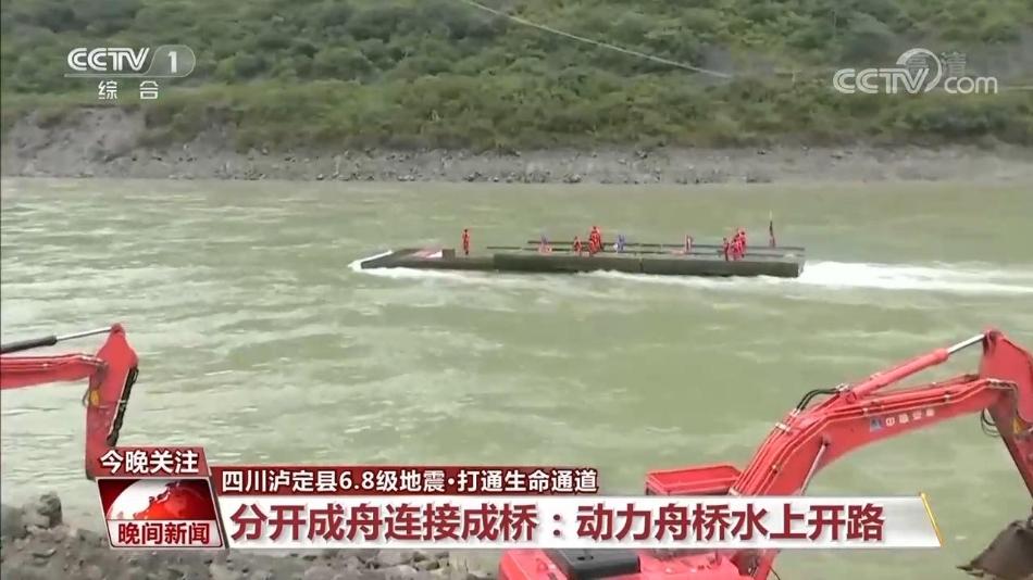 分开成舟,连接成桥,这是8日下午投入使用的动力舟桥。在得妥镇和磨西镇之间,突发的山体滑坡阻断了交通,救援力量迅速调派甲板宽、载重大的动力舟桥,打通了一条水上通道。