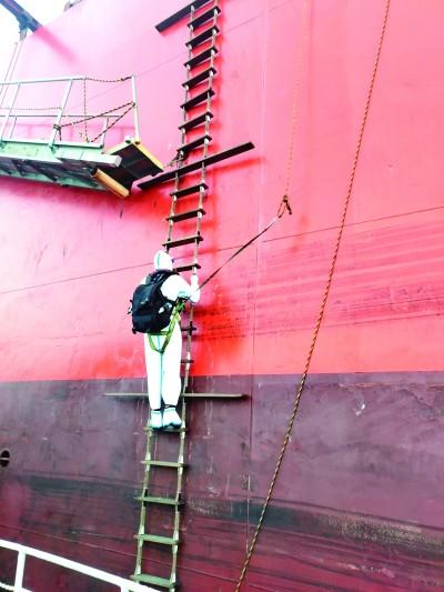 需要战胜的不仅仅是酷暑。登临检疫经常要乘小船前往锚地,身着防护服攀爬二十余米的软梯登上几十万吨级的油轮。在下船时,一旦海上起了风浪,拉开了小船与大船的距离,只能紧紧抓住软梯,等待风浪稍平,确保小船靠近大船在安全范围内,才能继续往下爬,稍有不慎,就会被两船夹伤或坠入海中。