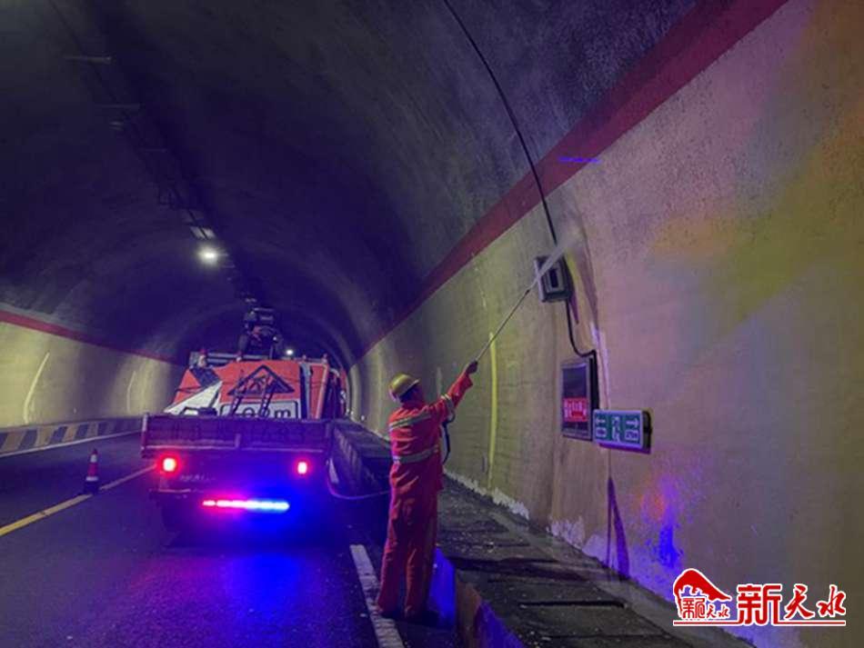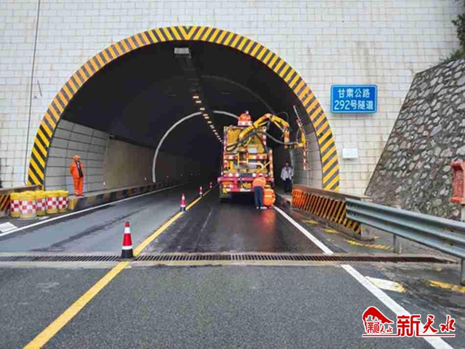 新天水讯【通讯员 王小强 谢旭斌】为全面提升公路隧道的通行环境,让人民群众在国庆期间平安出行,9月14日,张家川公路段组织人员机械对G566线张棉驿隧道进行了一次彻底的清洗。
