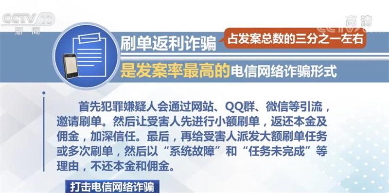 刷单返利诈骗是发案率最高的电信网络诈骗形式,占发案总数的三分之一左右。首先,犯罪嫌疑人会通过网站、QQ群、微信等引流,邀请刷单。然后让受害人先进行小额刷单,返还本金及佣金,加深信任。最后,再给受害人派发大额刷单任务或多次刷单,然后以“系统故障”和“任务未完成”等理由,不还本金和佣金。警方提示,刷单行为本身违法,一切需要你先充值或垫付资金的刷单行为都是诈骗。