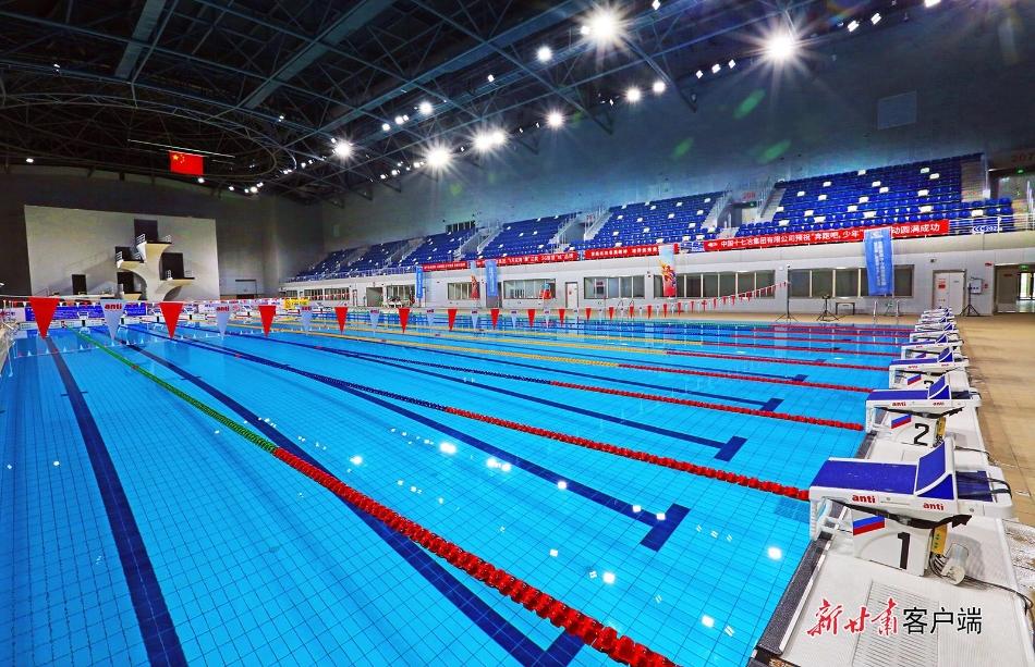在兰州奥体中心游泳馆,比赛泳池中水质清澈,环境整洁,运动员正在做训练前的热身活动。兰州奥体中心游泳馆通过技术手段可变换水池深度,不仅可以满足游泳和跳水比赛项目的要求,而且能够满足群众游泳健身、水上乐园、潜水培训等需求,可容纳3000名观众观看比赛。