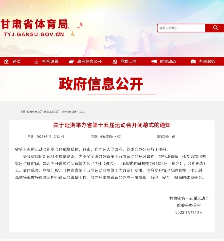 《通知》称,受甘肃省此轮新冠肺炎疫情影响,为安全圆满办好省第十五届运动会开闭幕式,给各项筹备工作及后续比赛留出合理时间,决定将开幕式时间调整为9月17日(周六),闭幕式时间调整为9月24日(周六),会期仍为8天。
