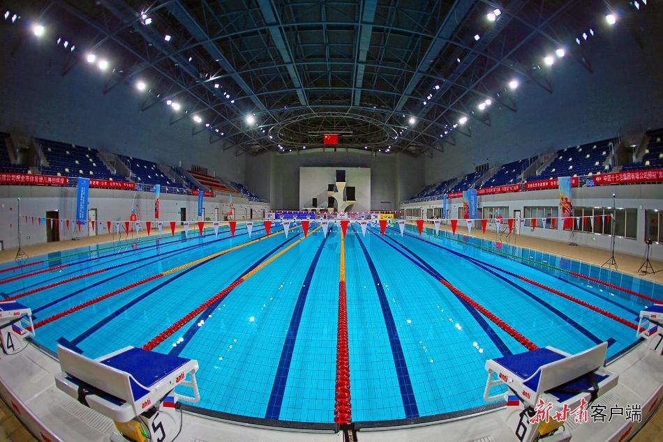 在兰州奥体中心游泳馆,比赛泳池中水质清澈,环境整洁,运动员正在做训练前的热身活动。兰州奥体中心游泳馆通过技术手段可变换水池深度,不仅可以满足游泳和跳水比赛项目的要求,而且能够满足群众游泳健身、水上乐园、潜水培训等需求,可容纳3000名观众观看比赛。