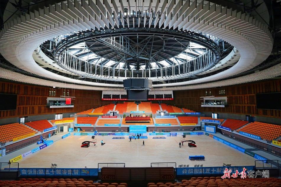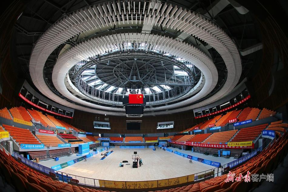在兰州奥体中心综合馆,场馆工作人员正在精心摆放篮球架和调试大屏计分显示器等设备。场馆中心的圆形穹顶造型十分惹人瞩目,由于采用了透光设计,白天自然光和人造光源让场馆里光线充足而柔和,更加有利于运动员们的发挥并赛出好成绩。由场馆穹顶中心悬挂下来的直播大屏矩阵,将保证场馆里8000名观众全方位观看无死角,满满的高科技。兰州奥体中心综合馆下预埋制冰系统可快速实现冰篮转换,除满足篮、排、羽、乒等室内高级别赛事及各类大型演出活动需求外,还可进行短道速滑和冰球比赛。