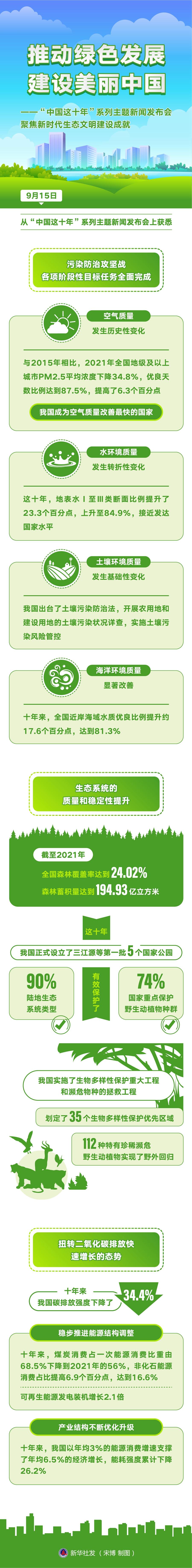 新华社北京9月15日电 题:推动绿色发展 建设美丽中国——“中国这十年”系列主题新闻发布会聚焦新时代生态文明建设成就