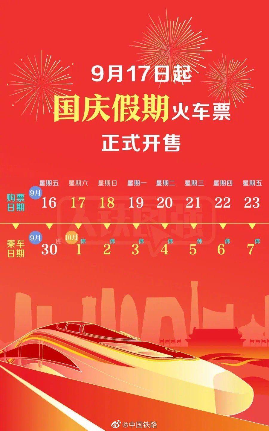 9月17日,旅客可以通过铁路12306网站、铁路12306APP购买国庆假期首日(10月1日)火车票。10月6日和7日火车票将分别于9月22日和23日开售。