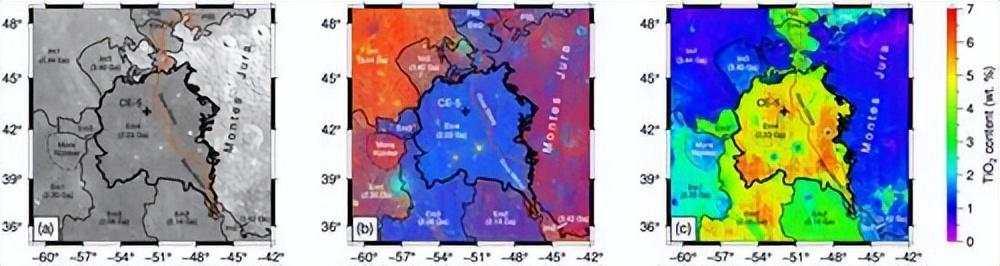(a)嫦娥五号着陆区光学影像。(b)嫦娥五号着陆区假彩色波段合成影像。(c)嫦娥五号着陆区钛含量分布图。(中科院国家空间科学中心供图)