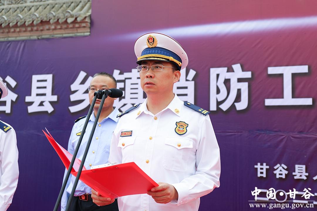 牛小强在致辞中说,今年以来,甘谷县委、县政府认真贯彻落实习近平总书记、李克强总理关于安全生产和消防工作的批示指示,严格按照国务院、甘肃省“十四五”消防安全规划和十五条硬性措施,着力加强基层消防监督力量建设,这既是国务院、省、市政府年度安全生产和消防工作考核的要求,也是提升基层末端火灾防控,遏制“小火亡人”事故的重要举措。今年是安全生产专项整治三年行动收官之年,也是党的二十大召开之年,县消防救援大队要努力践行习近平总书记“人民至上、生命至上”理念,守初心、担使命,立足新形势、新任务,积极探索创新基层监管模式、完善管理机制,加强对消防工作站的指导帮扶,同乡镇消防工作站密切配合,扎实推进生产、经营、租住自建房专项整治和泡沫彩钢板建筑“清零”行动,坚决防范重特大火灾事故的发生,加快推进基层消防治理体系和治理能力现代化,全力以赴在新的起点上实现新突破、彰显新担当,为加快建设幸福美好新甘谷提供更加有力的消防安全保障。