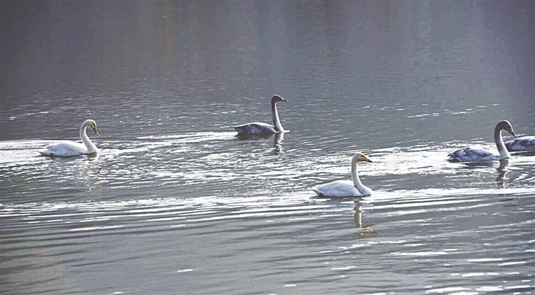 “2017年初冬,我们在巡河过程中看到河咀村附近的水面上有一只白天鹅,正当大家走近看时,白天鹅快速离开了。”岔路村村民刘海凤回忆说,那是当地村民第一次在“三江口”见到天鹅。后来,那只天鹅又飞了回来,还带来了一只同伴。第二年春天天气暖和后,两只天鹅飞走了。让大家没想到的是,初冬时节,又飞来了8只天鹅。从此,每年冬季都会有天鹅来此栖息,数量也在逐年增加。到2021年冬季,天鹅数量猛增到37只。与此同时,其他水鸟的种类也在增加。湿地内初步记录有鸟类11种,记录到湿地水鸟6种,有赤麻鸭、绿头鸭、野鸳鸯、白鹭等,湿地生物多样性更加凸显。