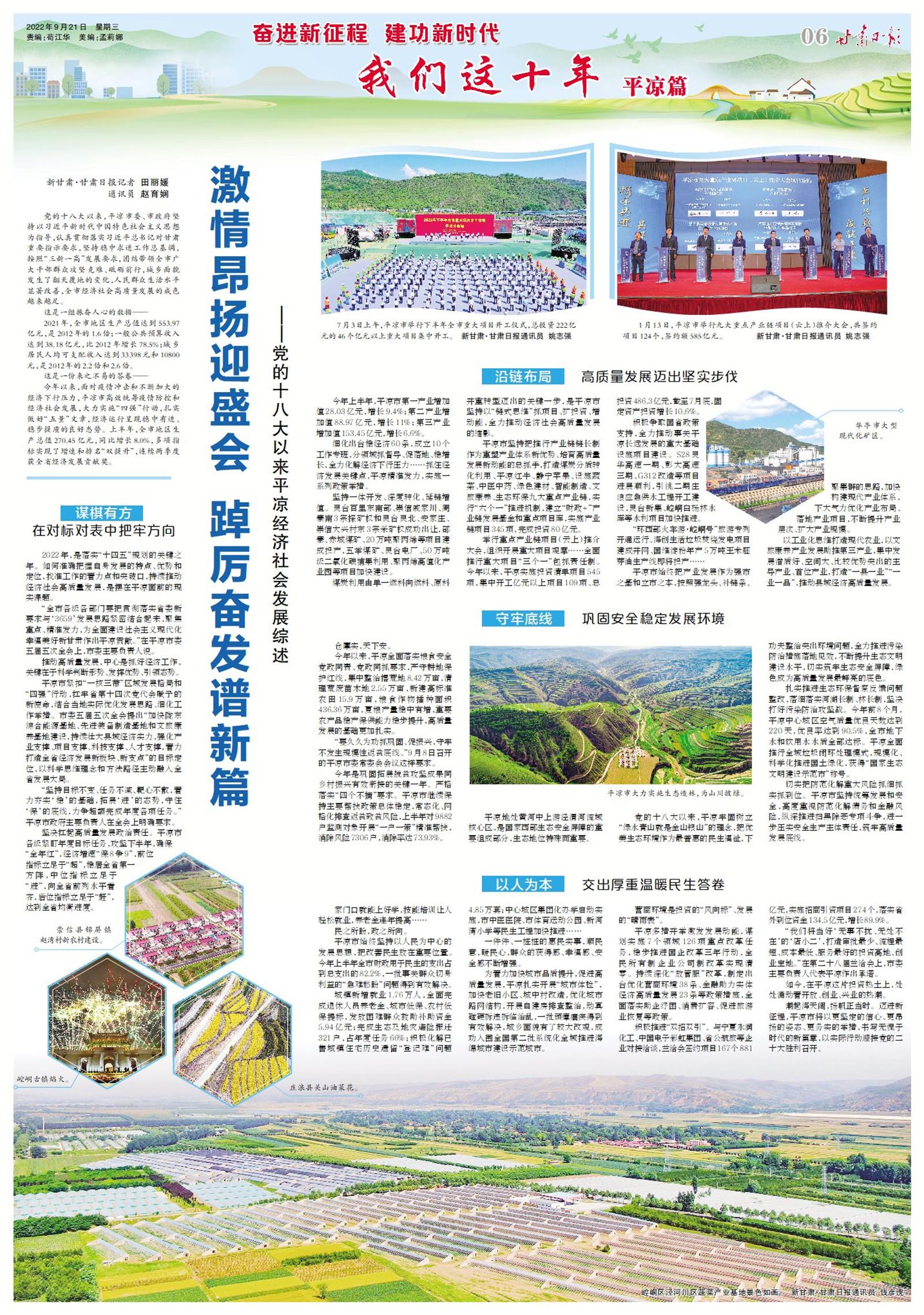 党的十八大以来,平凉市委、市政府坚持以习近平新时代中国特色社会主义思想为指导,认真贯彻落实习近平总书记对甘肃重要指示要求,坚持稳中求进工作总基调,按照“三新一高”发展要求,团结带领全市广大干部群众攻坚克难、砥砺前行,城乡面貌发生了翻天覆地的变化,人民群众生活水平显著改善,全市经济社会高质量发展的成色越来越足。