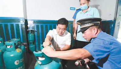 陶湘闽(左一)在检查燃气供应站的安全监管工作。