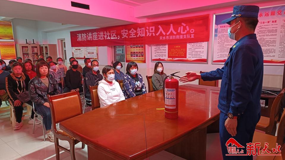 当天下午,秦州区消防大队官兵,为该社区干部群众,从火灾防范,现场演示,消防器材使用,及火灾初期自救和灭火等方面,开展了集中培训。