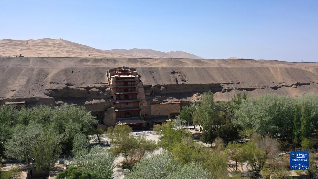 这是世界文化遗产莫高窟的标志性建筑——第96窟窟外木构建筑九层楼(2022年4月18日摄,无人机照片)。新华社记者 陈斌 摄