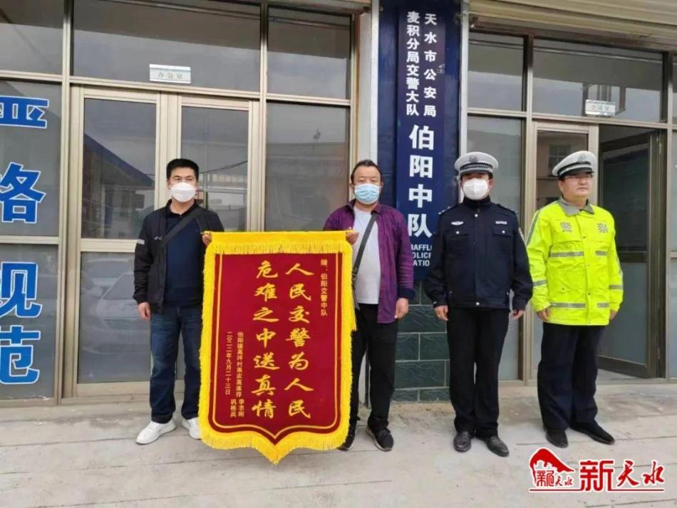 9月25日,麦积区伯阳镇高坪果农高连存几人将一面写有“人民交警为人民 危难之中送真情”锦旗送到天水市公安局麦积分局交警大队伯阳中队民警手中,对民警为民服务的精神表示称赞。
