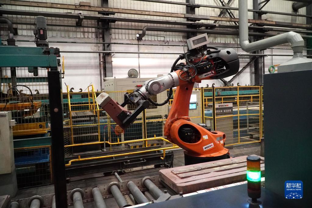 在位于山东省潍坊市的潍柴(潍坊)材料成型制造中心的生产车间,一台机械手在工作(9月19日摄)。新华社记者 徐速绘 摄