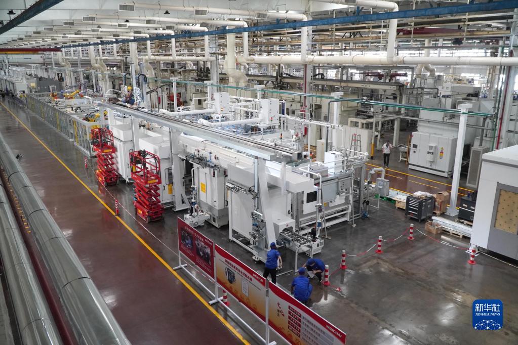 在山东省潍坊市,潍柴集团的工作人员在一条新的生产线上安装调试设备(9月19日摄)。新华社记者 徐速绘 摄