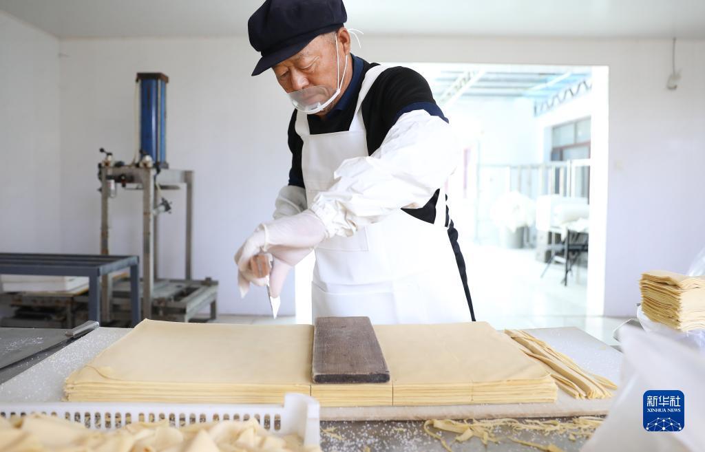 9月19日,工人在昌图红瑞食品酿造有限公司生产车间内切割干豆腐。新华社记者 姚剑锋 摄