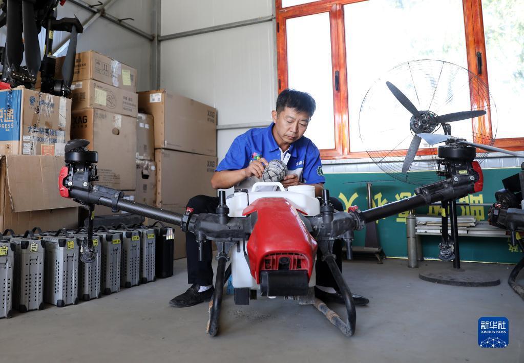 9月19日,种粮大户盛铁雍对植保无人机进行保养。新华社记者 姚剑锋 摄