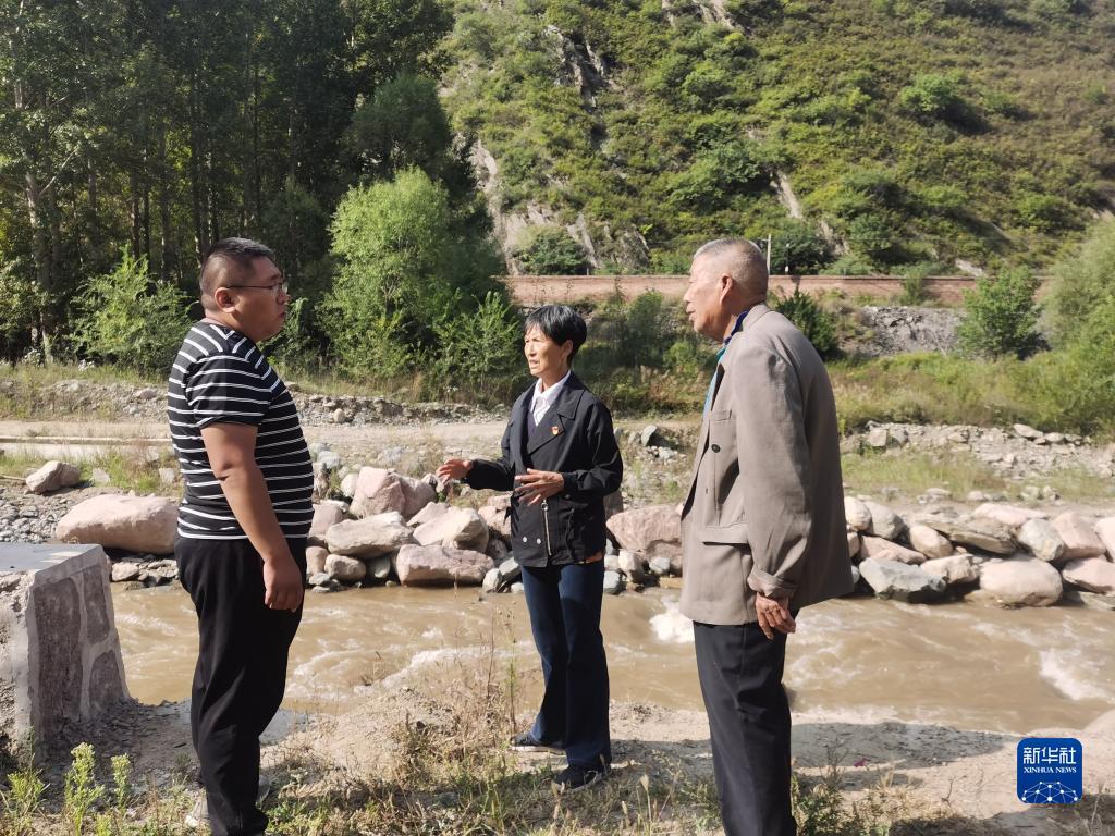 刘桂珍(中)与代县水利局工作人员商量解决供水管道问题(2022年9月15日摄)。新华社记者 梁晓飞 摄