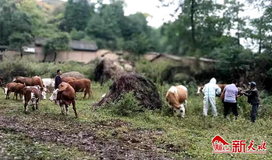 9月27日,在秦州区杨家寺镇煤湾村,来自秦州区畜牧兽医事务服务中心和镇防疫站的动物防疫人员正在给秦州区祥源种养殖农民专业合作社的牛注射疫苗。