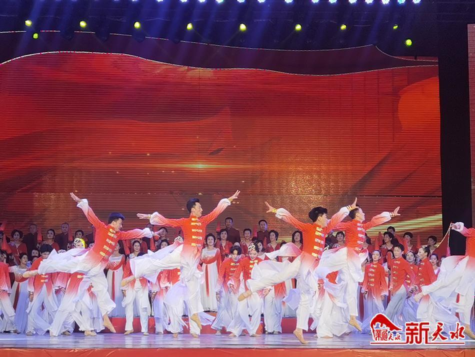 激情的舞蹈《永远的信仰》、《致富路上蜜桃甜》、《五十六个民族心向党》跳出了天水人民勤劳致富、蓬勃发展的生机;悠扬的歌曲《领航新时代》、《美丽的天水我的家》、《天水蓝》歌唱天水、赞美天水,唱出了天水人民对美好生活的期许;小品《村长开会》用“村长”这一艺术形象,把一个活生生的村干部展现在观众面前,宣传党的农村政策,用艺术的形式反映西北农村发生的巨大变化;非遗节目《非遗荟萃谱新篇》、戏曲《秦风秦韵颂党恩》、音乐快板《夸夸我们的新天水》,表达出了天水人民对家乡的热爱和对党的深情厚谊。最后,晚会在歌伴舞《领航》演出中结束,全体演员齐声高唱,铿锵有力的旋律、激昂动听歌声表达了天水人民永远跟党走的信心决心和奋力谱写新征程的豪迈壮志。