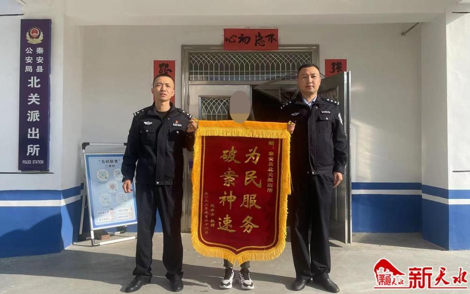 新天水讯【记者张彬霞】“太感谢你们了,让我及时挽回经济损失……”9月26日,秦安县一名女士将一面印有“为民服务 破案神速”锦旗送至秦安县公安局北关派出所民警手中时激动地说。