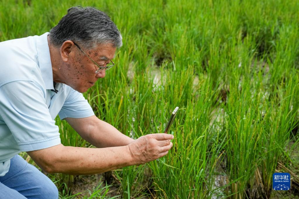 赵亚夫在江苏省句容市天王镇戴庄村查看水稻长势(2022年9月9日摄)。新华社记者 李博 摄