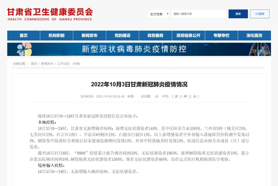 现将10月3日0—24时甘肃省新冠肺炎疫情信息公布如下:
