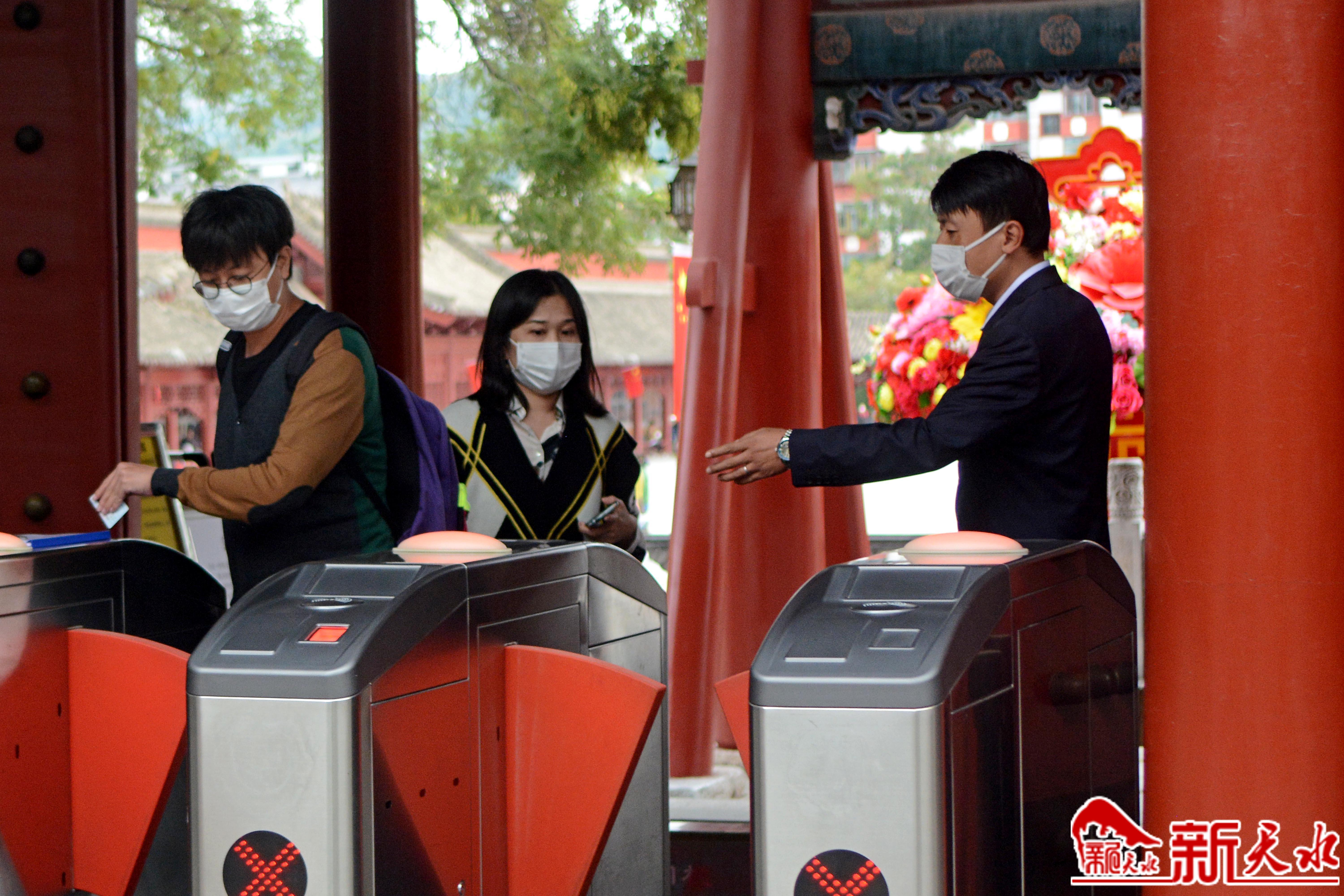 伏羲庙景点工作人员引导游客进庙参观
