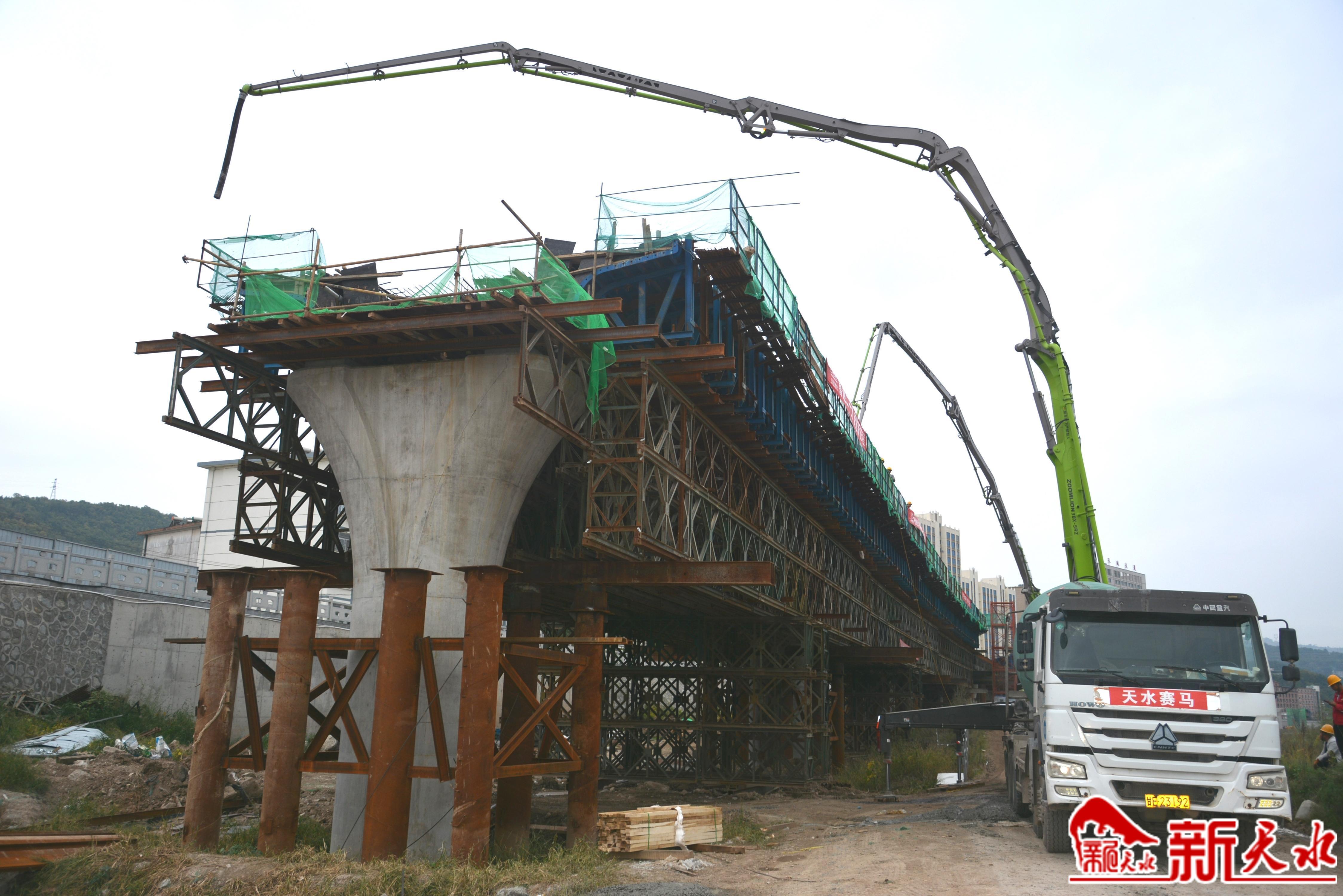 记者在秦州区迎宾桥附近看到,施工人员正在吊装钢管支架,为贝雷梁安装做准备。在五里铺大桥以西,藉河特大桥72号至75号墩台的现浇箱梁施工正在火热进行中,从早上7时30分开始,要连续不间断作业至晚6时30分左右,施工人员吃饭都在浇筑现场。这座预应力砼现浇箱梁为一联三跨,全长90米,设计混凝土545方,两台混凝土泵车同时浇筑,需要11个小时才完成浇筑。