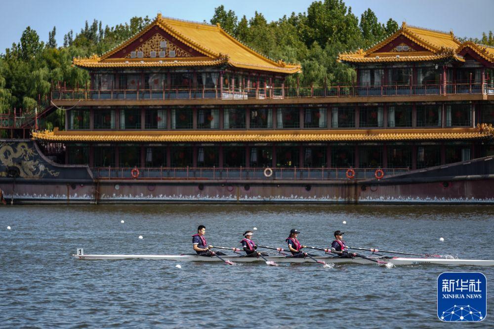 ↑市民在位于北京市通州区的京杭大运河上进行赛艇比赛(2022年9月18日摄)。新华社记者 彭子洋 摄