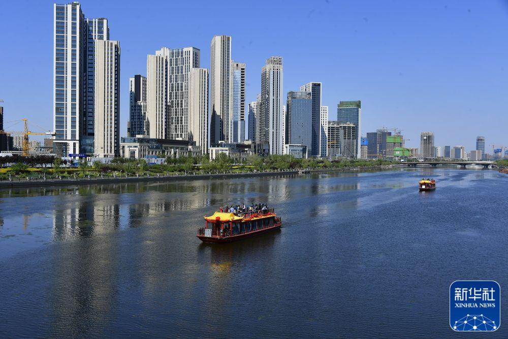 ↑游船驶过位于北京市通州区的运河商务区(2020年4月26日摄,无人机照片)。新华社发(常鸣 摄)