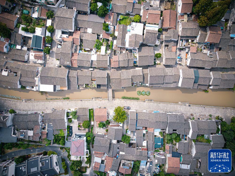 ↑从杭州西兴老街流淌而过的浙东运河(2022年9月27日摄,无人机照片)。新华社记者 江汉 摄
