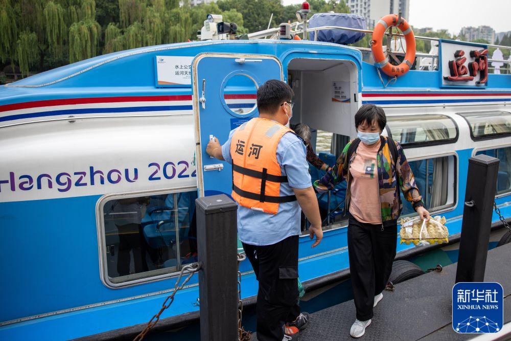 ↑居住在大运河周边的杭州市民乘坐“运河”号水上巴士出行(2022年9月29日摄)。新华社记者 江汉 摄