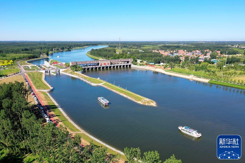 ↑游船驶过大运河京冀交界处杨洼闸(2022年6月24日摄)。新华社记者 彭子洋 摄