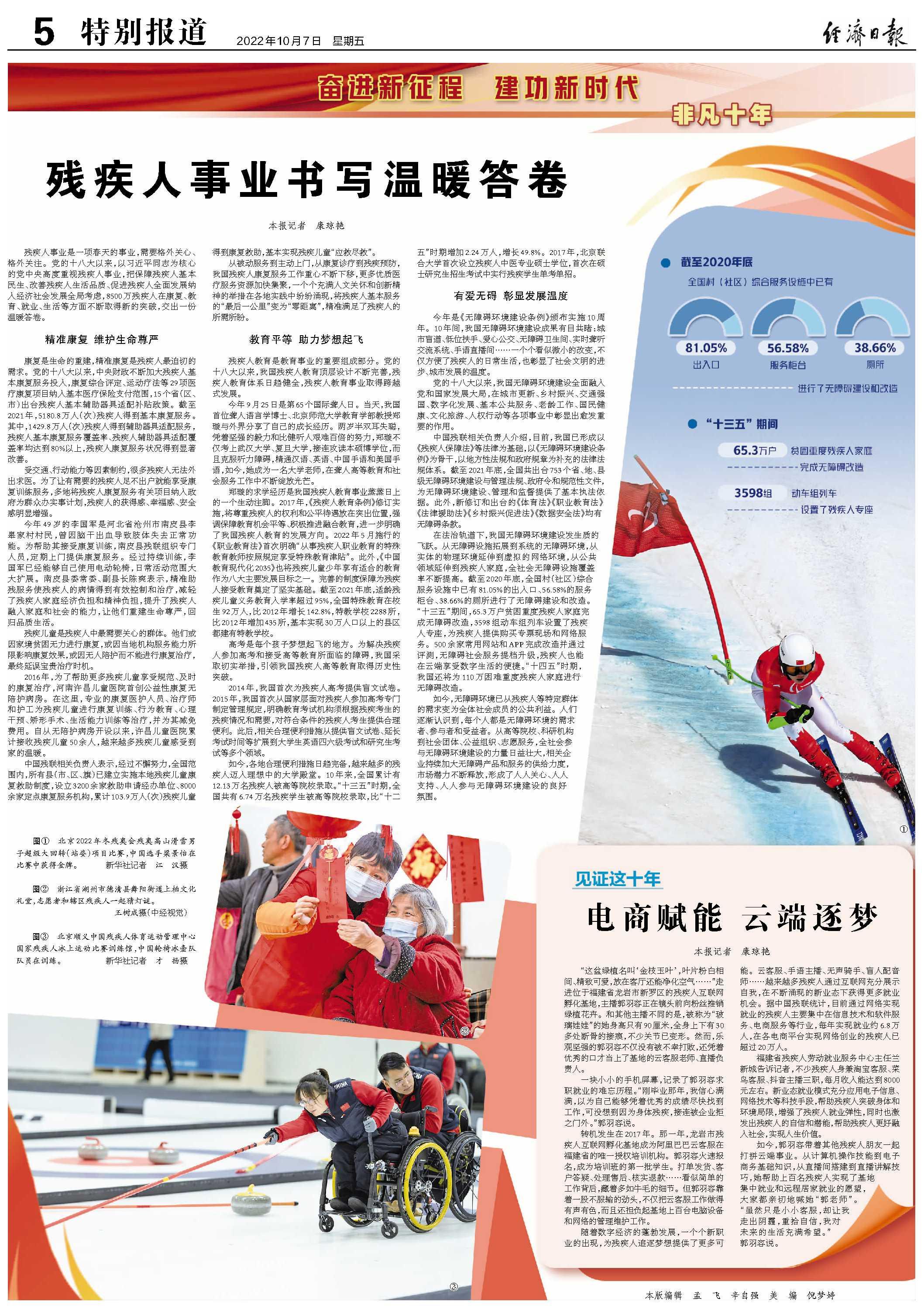 在法治轨道下,我国无障碍环境建设发生质的飞跃。从无障碍设施拓展到系统的无障碍环境,从实体的物理环境延伸到虚拟的网络环境,从公共领域延伸到残疾人家庭,全社会无障碍设施覆盖率不断提高。截至2020年底,全国村(社区)综合服务设施中已有81.05%的出入口、56.58%的服务柜台、38.66%的厕所进行了无障碍建设和改造。“十三五”期间,65.3万户贫困重度残疾人家庭完成无障碍改造,3598组动车组列车设置了残疾人专座,为残疾人提供购买专票现场和网络服务。500余家常用网站和APP完成改造并通过评测,无障碍社会服务提档升级,残疾人也能在云端享受数字生活的便捷。“十四五”时期,我国还将为110万困难重度残疾人家庭进行无障碍改造。