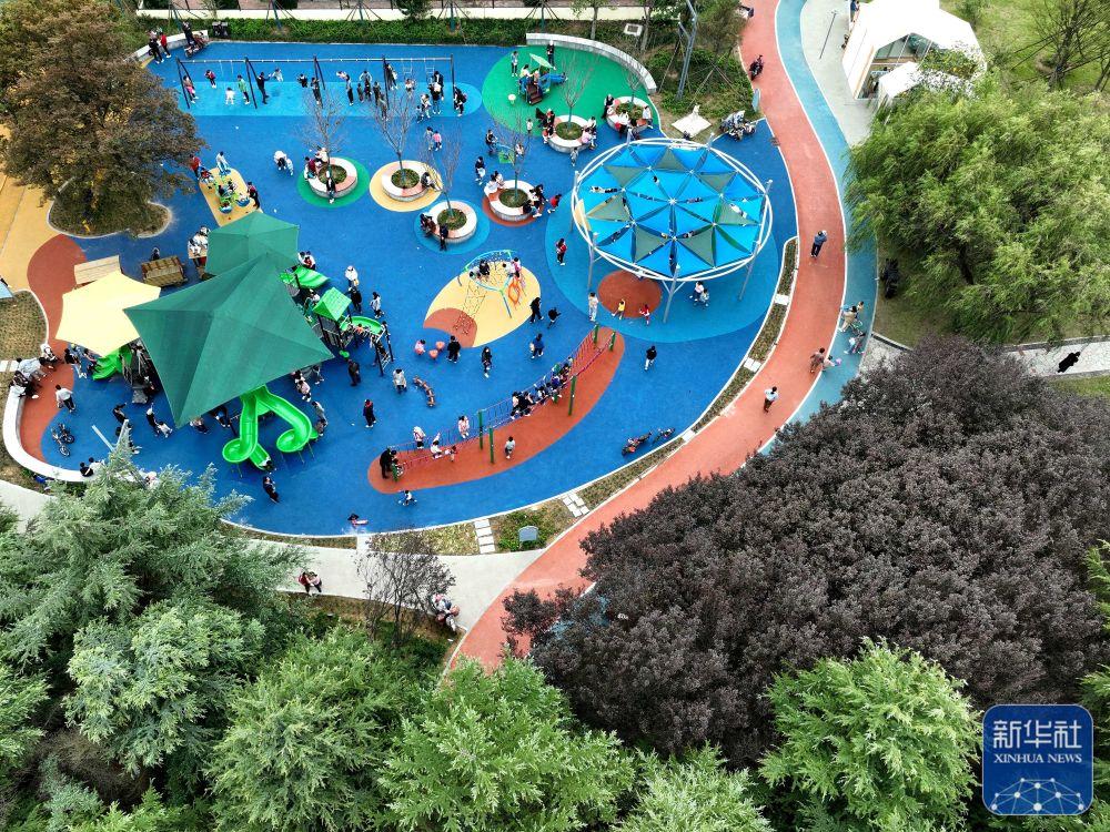 10月6日,青少年在山东青岛西海岸新区双珠公园游乐场玩耍(无人机照片)。新华社发(王培珂摄)
