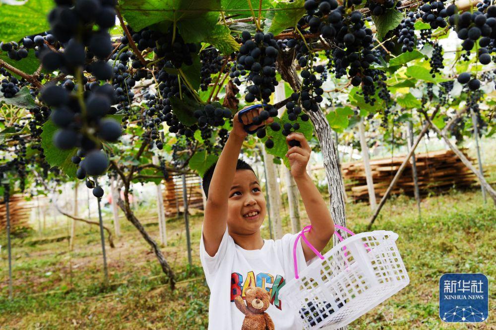 10月6日,小朋友在贵州省黔南布依族苗族自治州福泉市陆坪镇罗坳村一处果园里采摘葡萄。新华社发(易盛武摄)