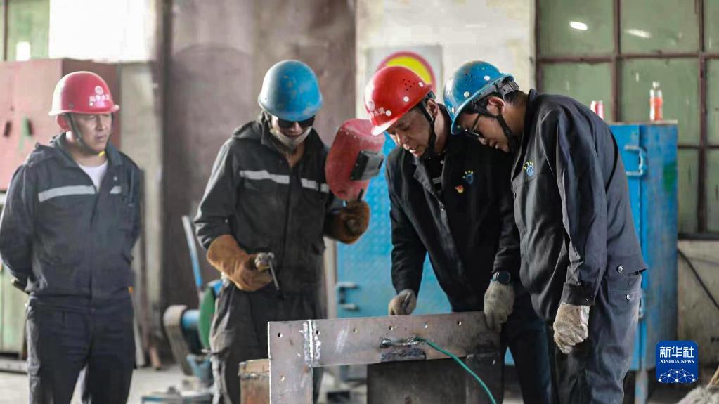 旦增顿珠(右二)和工友在维修设备(2022年7月13日摄)。新华社发