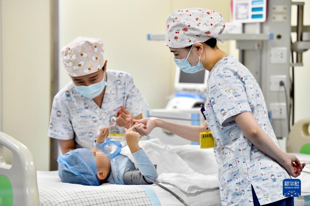 在山东省枣庄市妇幼保健院儿童ICU病房,医护人员为完成靶向治疗药物诺西那生钠的4岁脊髓性肌萎缩症患儿加油鼓劲(2022年1月1日摄)。诺西那生钠注射液是我国首个获批治疗脊髓性肌萎缩症的进口药物,2019年进入中国市场时,每针价格近70万元。在2021年国家医保目录药品谈判中,以3.3万元每针的价格进入新版医保药品目录。新华社记者 郭绪雷 摄