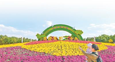 河北省秦皇岛市海港区麻念庄郊野公园日前向公众开放,公园精心布置喜迎二十大主题景观。图为游客正在拍照留念。