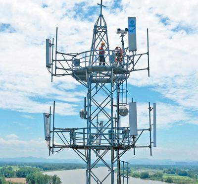 安徽省铜陵市义安区胥坝乡,工作人员在5G基站铁塔上调测天线。5G融合应用已在工业、医疗、教育、交通等多个行业领域发挥赋能效应,覆盖国民经济40个大类,应用案例数超过2万个。