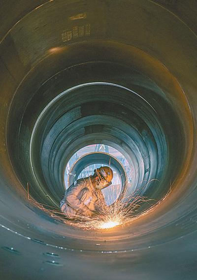 我国加快构建清洁绿色低碳的能源产业体系,用好制造业新技术成果。图为广东省中远海运重工生产车间,工人在赶制海上风电管桩订单。