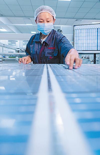 江苏省扬中市油坊镇上迈新能源科技有限公司生产车间,工人正在生产一批出口欧美的太阳能光伏电池组件。近年来,我国光伏产业发展势头强劲,国际竞争优势凸显,产品出口总额再创新高。